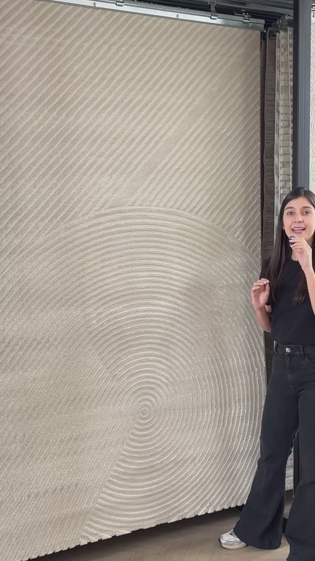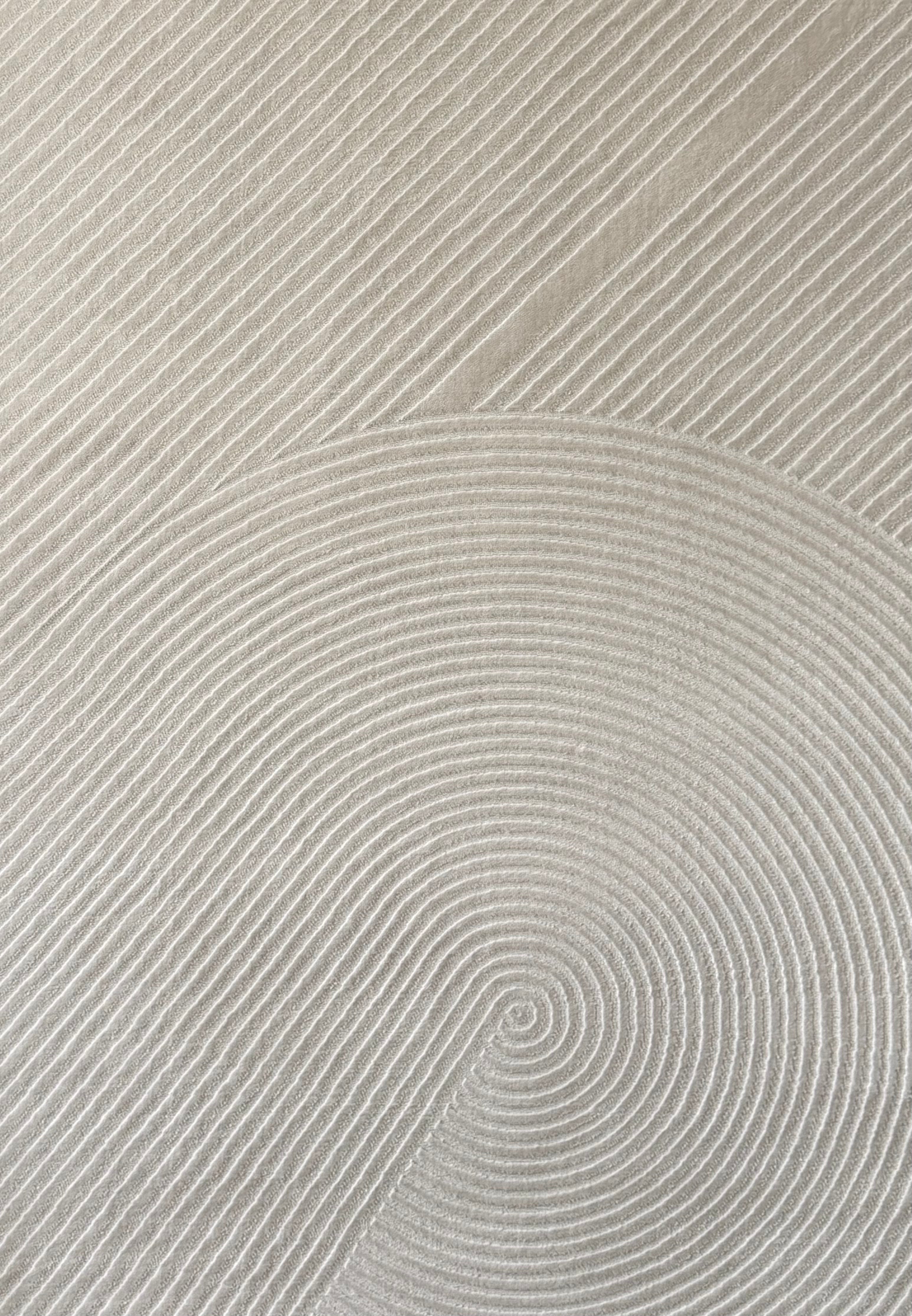 Un diseño que evoca el movimiento del agua o las líneas de un campo arado: una gran espiral que nace desde el centro y se despliega en arcos concéntricos hasta cubrir toda la superficie.