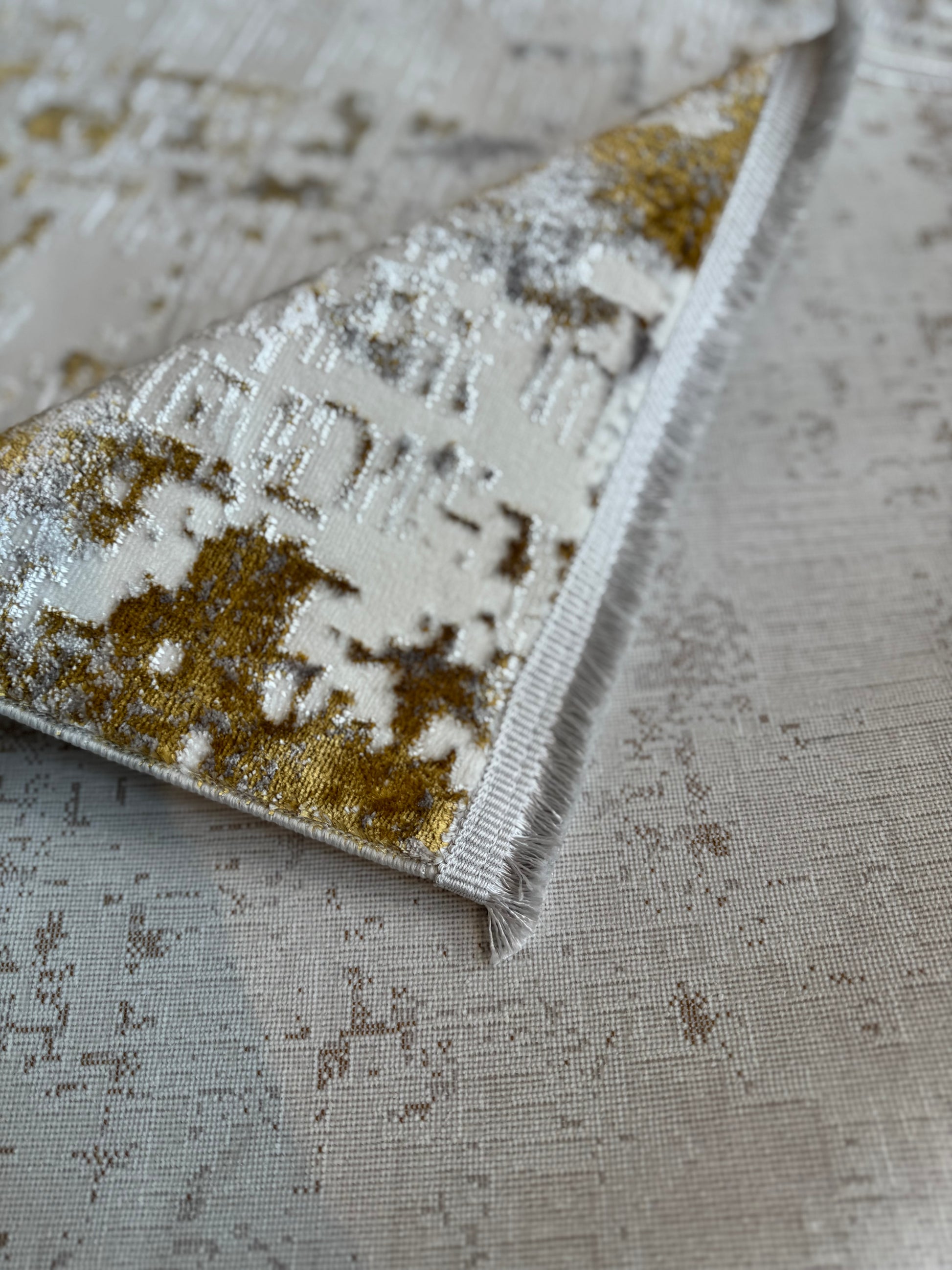 Esta alfombra de seda y terciopelo despliega una base en tonos beige enriquecida con delicados matices dorados que crean un efecto sofisticado, lleno de luminosidad y refinamiento.