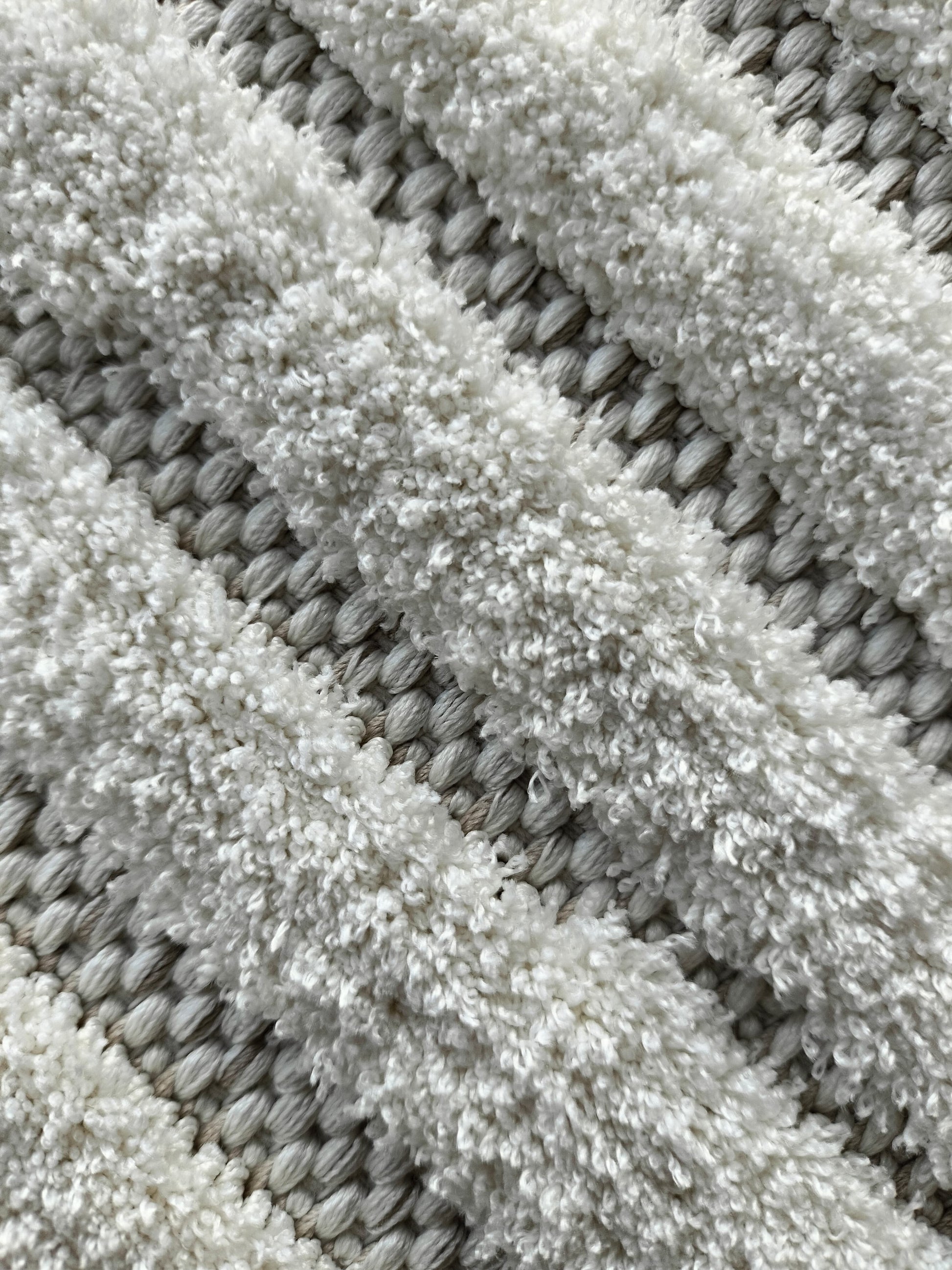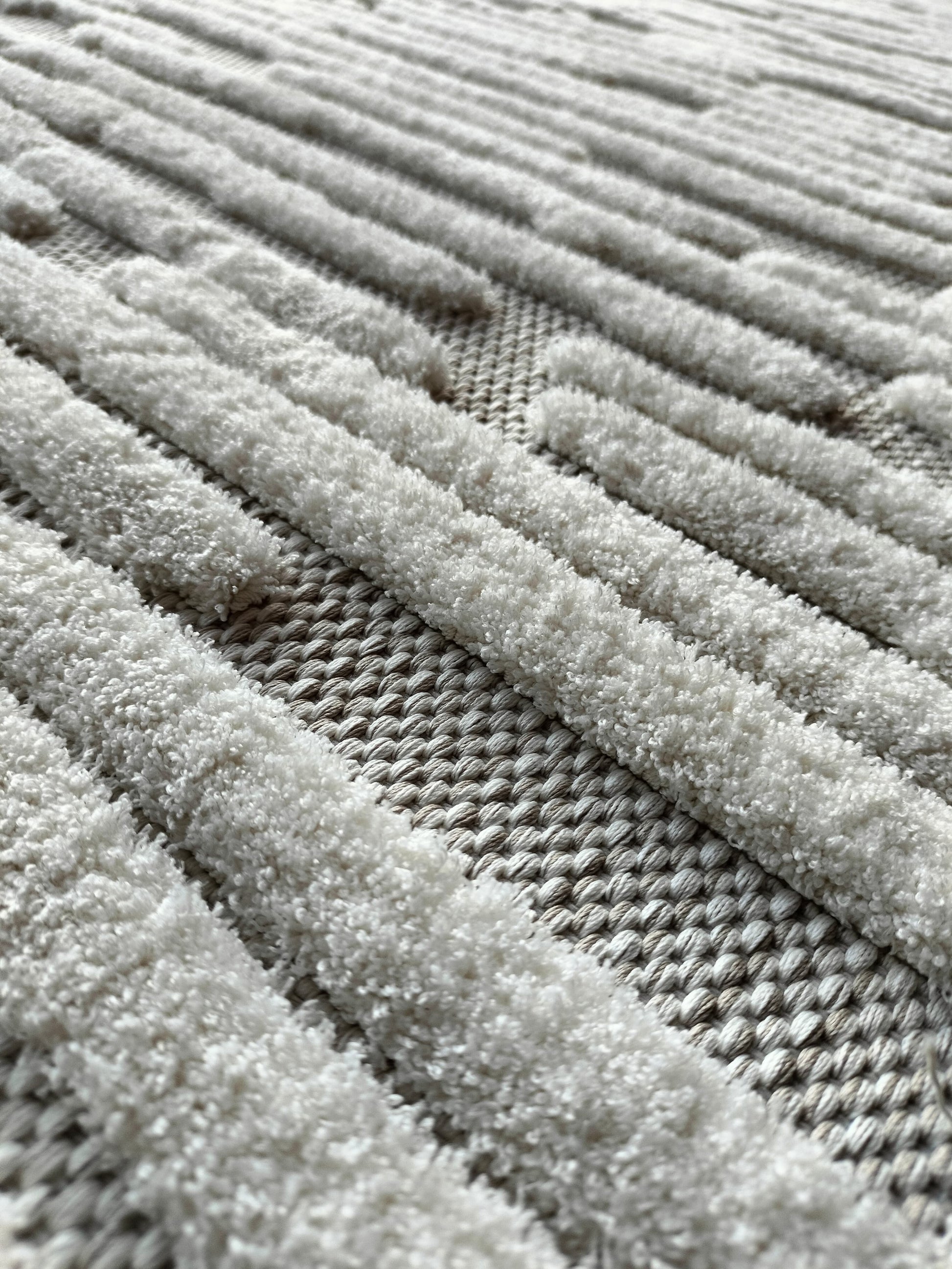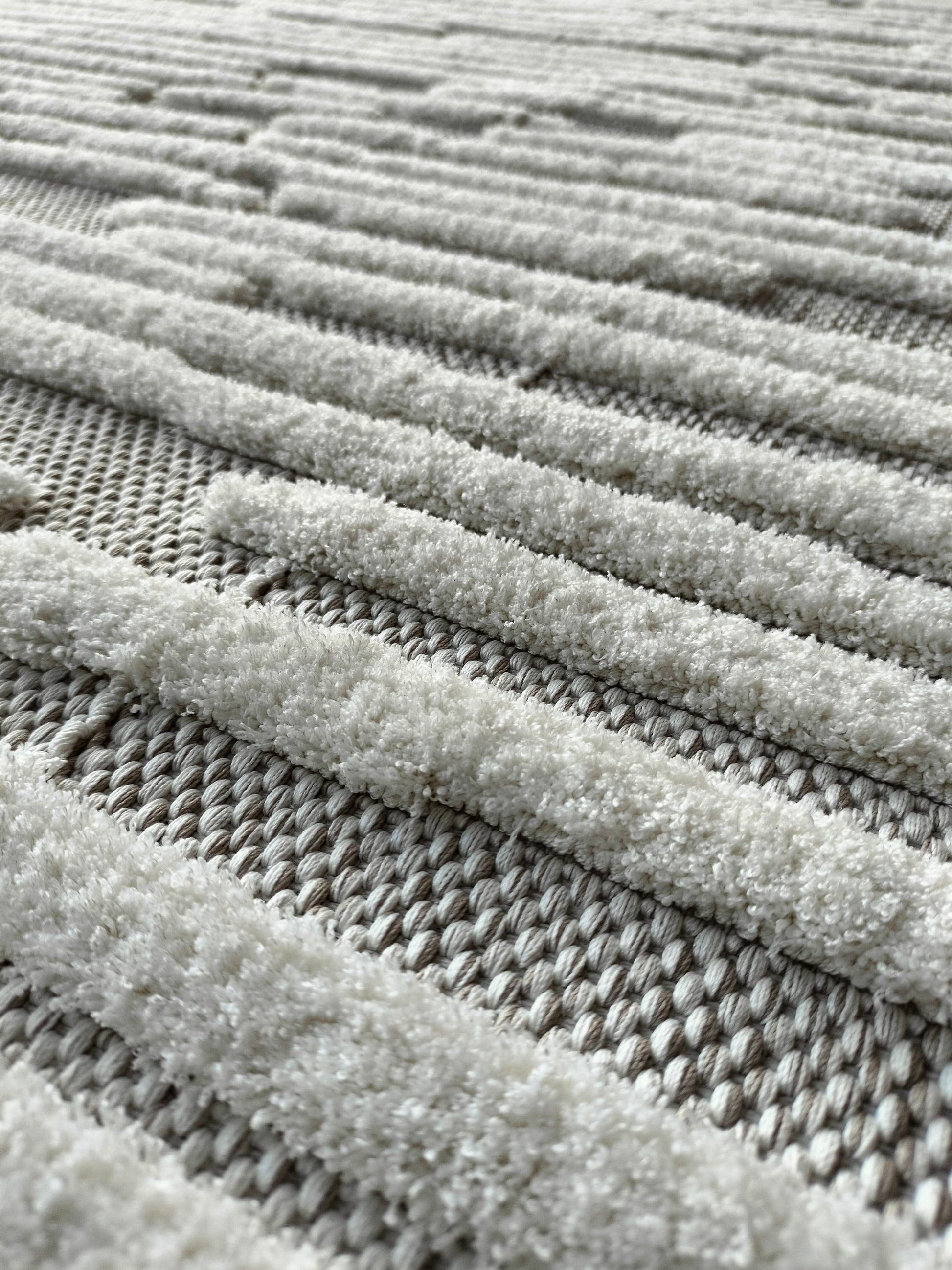 Una alfombra de estética limpia y sofisticada que se distingue por su delicado diseño en relieve. Con una base en tono blanco hueso y sutiles matices en gris, esta pieza aporta un aire moderno y atemporal, ideal para quienes buscan elegancia discreta y refinamiento en su decoración. Su diseño minimalista y equilibrado la convierte en una opción versátil que realza salas luminosas, dormitorios principales o espacios de estilo contemporáneo con un toque distintivo. Más que un accesorio decorativo, es una obra textil que transforma cualquier ambiente con serenidad y sofisticación, manteniendo siempre un carácter exclusivo.