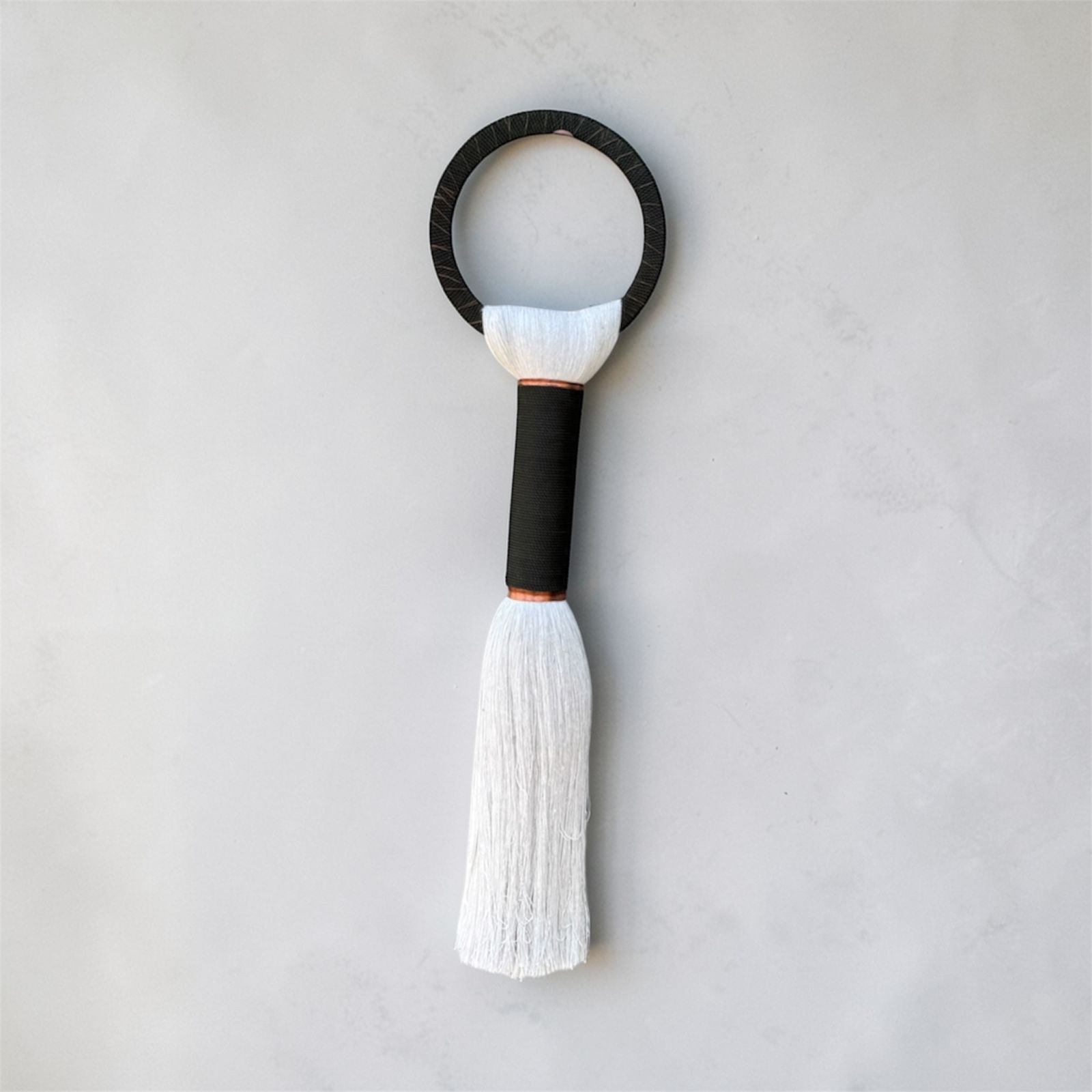 Cuerda para mural artesanal de formato escultórico, elaborado a mano con hilaza y detalles en cobre. Su diseño minimalista y su contraste en tonos negro crean una pieza de acento elegante y contemporánea, personalizable para adaptarse a distintos espacios.