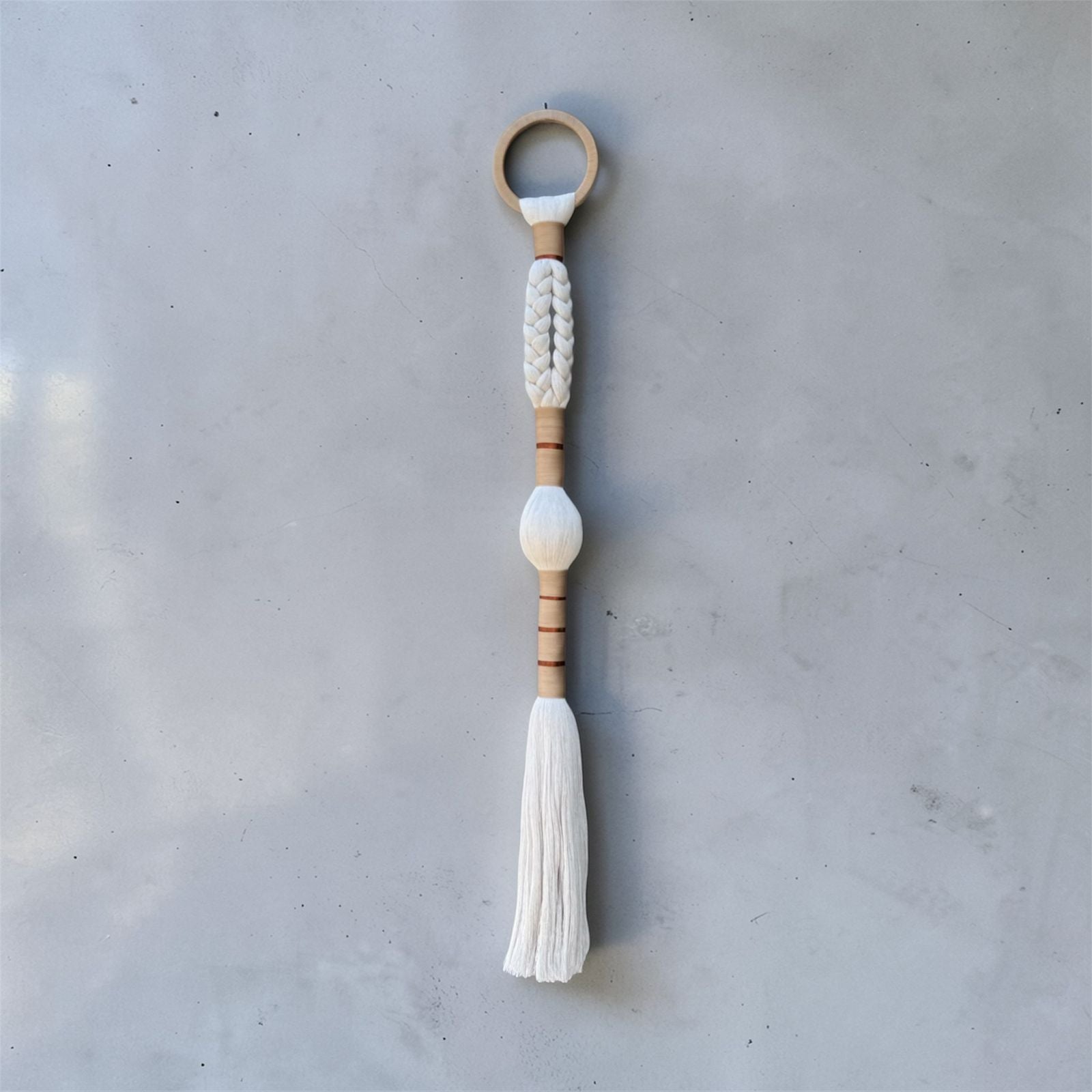 Colgante textil artesanal en algodón crudo. Trenza abierta en la parte superior, forma abultada central y fleco caído, unidos por enrollados en tejidos en tonos naturales con acentos en colores terracota. Anillo de madera clara. Una pieza de paleta cálida y construcción ligera, adecuada para sala, recibidor o dormitorio.