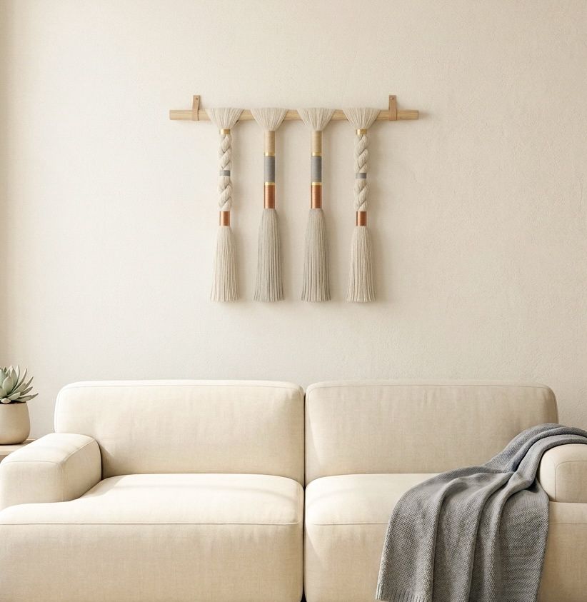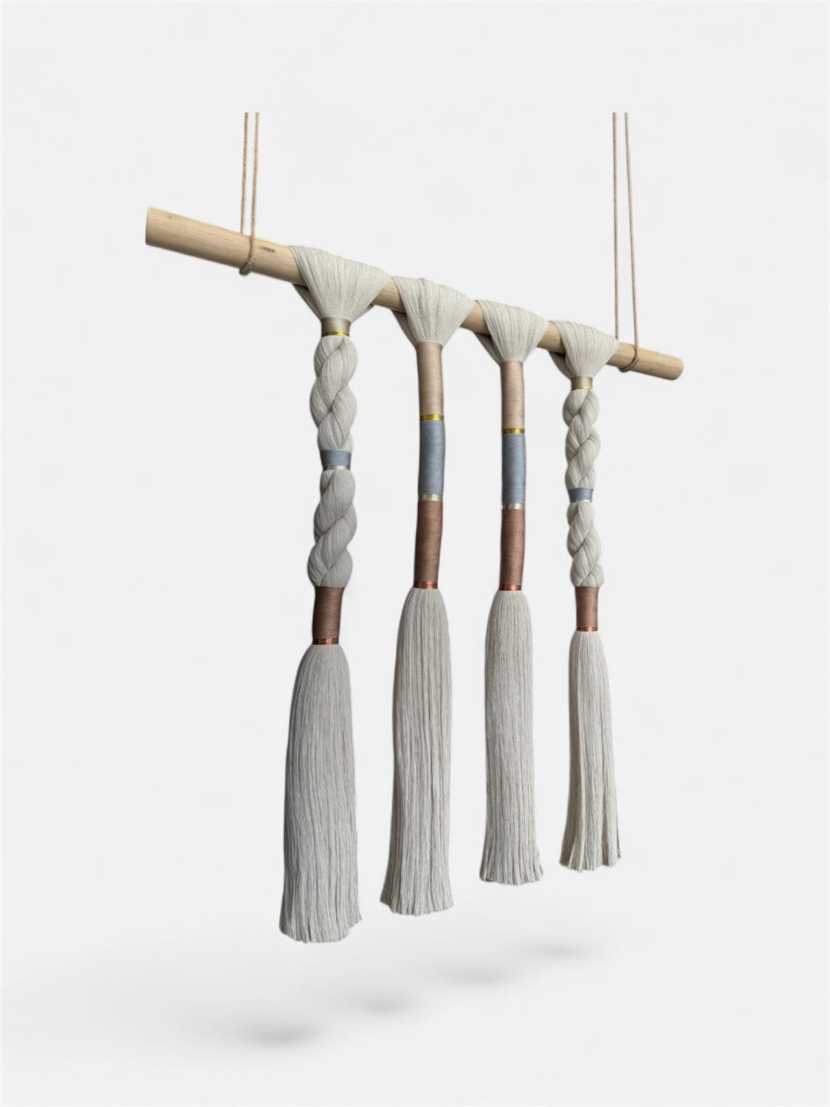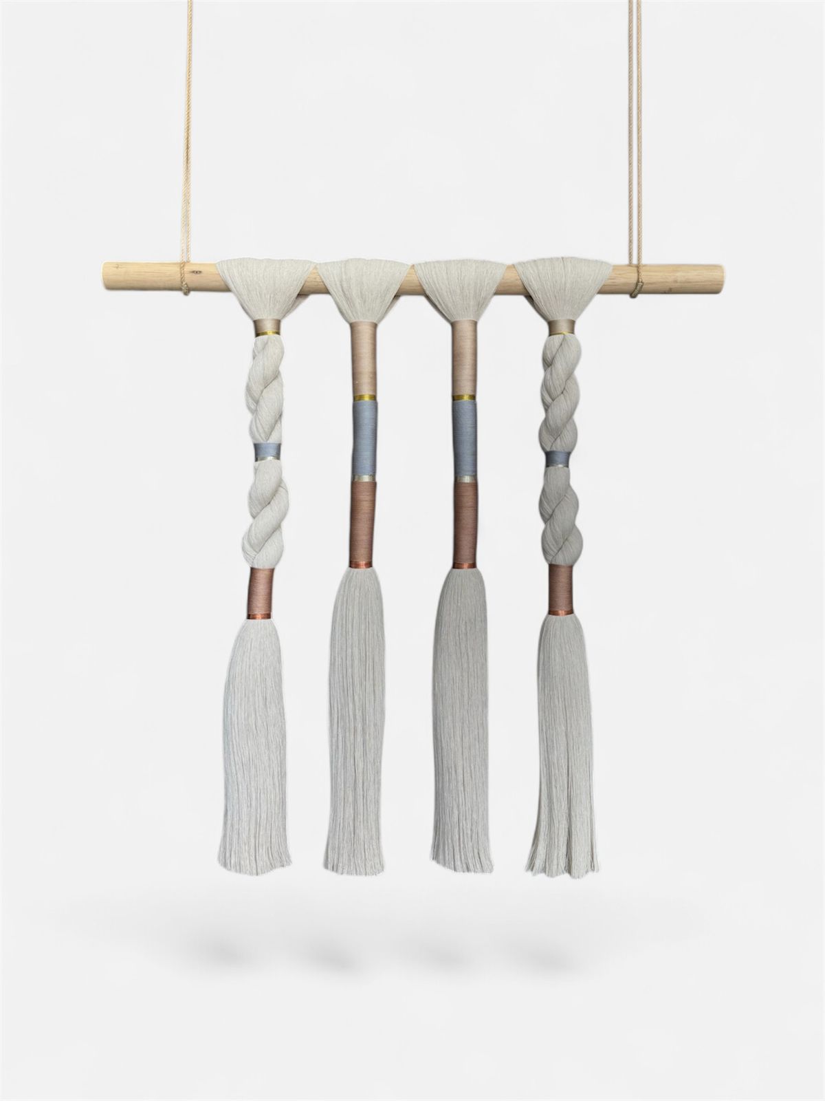 Tapiz para mural, textil artesanal, elaborado a mano con hilaza y detalles en cobre. Su paleta en tonos neutros y blancos suaves aporta equilibrio y sofisticación, y su opción de personalización lo convierte en una pieza única para transformar cualquier espacio con textura y diseño.