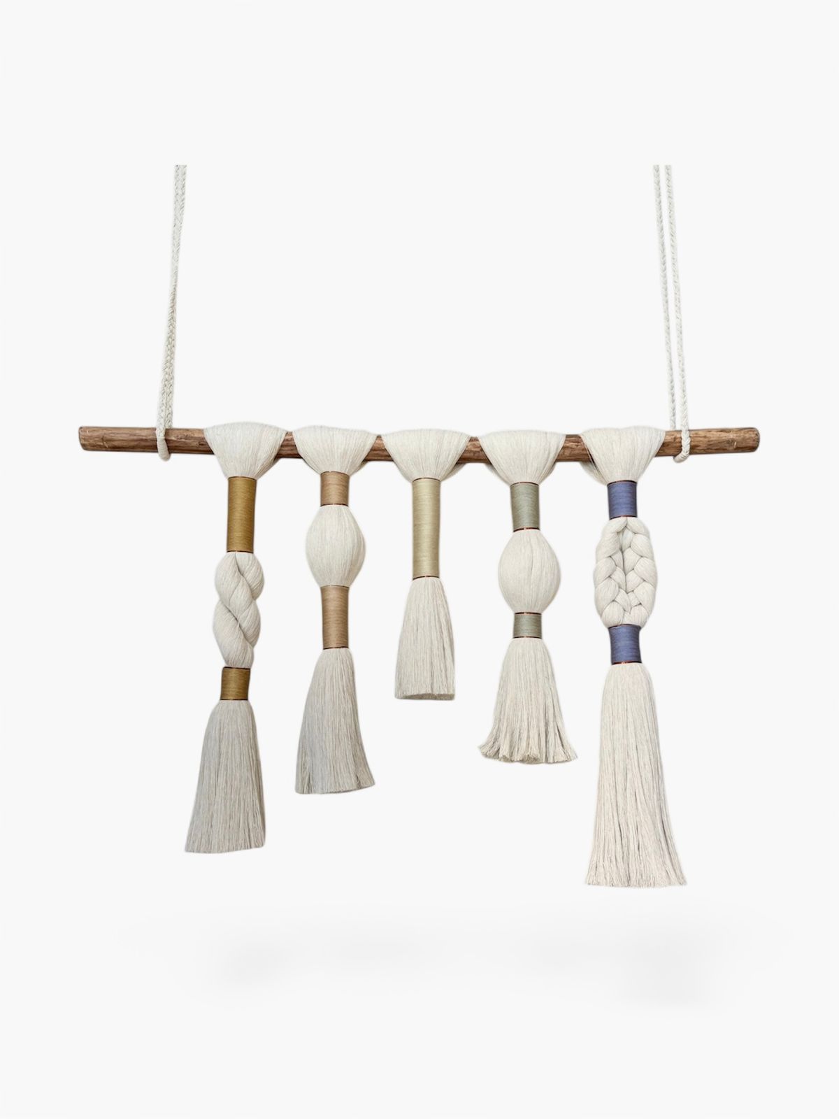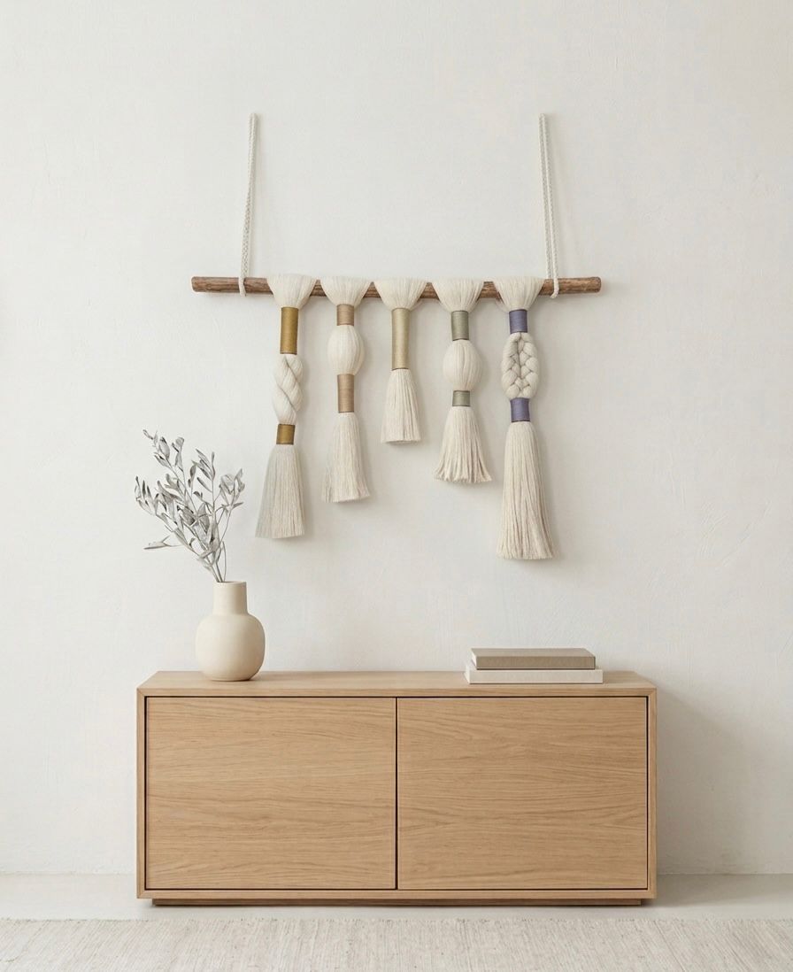 Tapiz mural textil artesanal, elaborado a mano con hilaza en tonos cálidos y acentos dorados y sutiles matices en azul. Su combinación de tramas y volúmenes aporta profundidad y carácter, y su opción de personalización lo convierte en una pieza única para cada espacio.